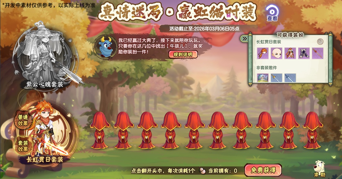 牛孩儿藏在10位蒙面神秘人中,掀开头巾找出牛孩儿,即可获得一件联动部件,并进入下一轮,直到获得本期所有联动服饰部件为止。若未选中目标,可获得道具奖励,每10次必定获得1件未拥有的联动部件。
