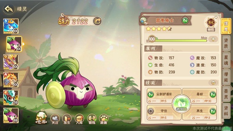 特性选择吸水,降低50%的水系攻击伤害,并回复所有技能的1点PP值,圣灵选择6休憩。没有攻击的回合回复5%的生命值,(小西普们在捕捉小葱的时候可以点击对应精灵查看特性,直接捕捉带有“吸水“”特性的精灵”)