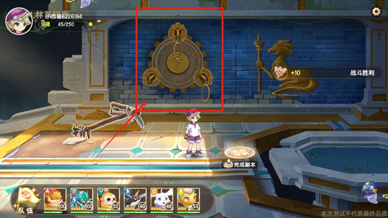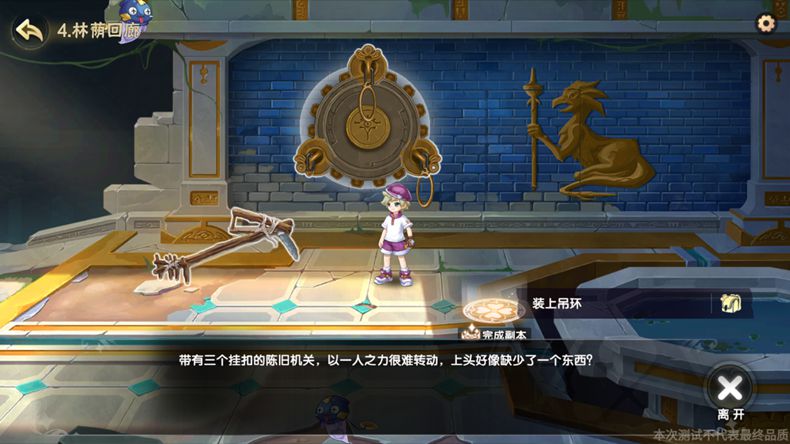 挑战成功后,完成关卡结算返回场景 !!此时不要点击完成副本!! 点击一下墙壁上的机关轮盘,装上第6关获得的“小幽的吊环”