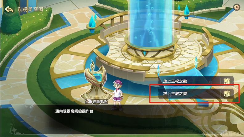接下来,返回永恒梦境第6关:观景高阁,按照之前的流程到达最终场景,挑战“青空翼卫”后,来到启动平台,此时会多出一个选项“放上主教之契”,放上后将触发剧情,坐电梯前往高阁中部
