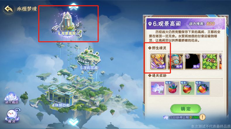 驯宠师等级达到15级后,将解锁永恒梦境第6关:观景高阁,在关卡详情页中可以看到野生精灵列表中出现了“圣光宝蛇”的身影