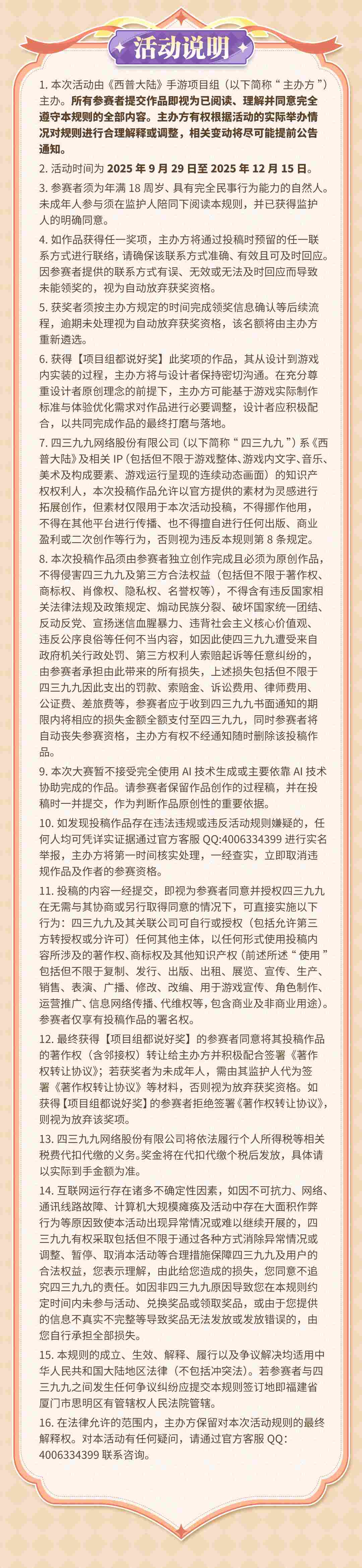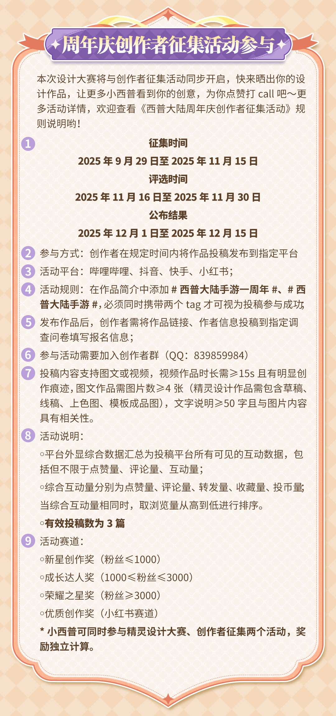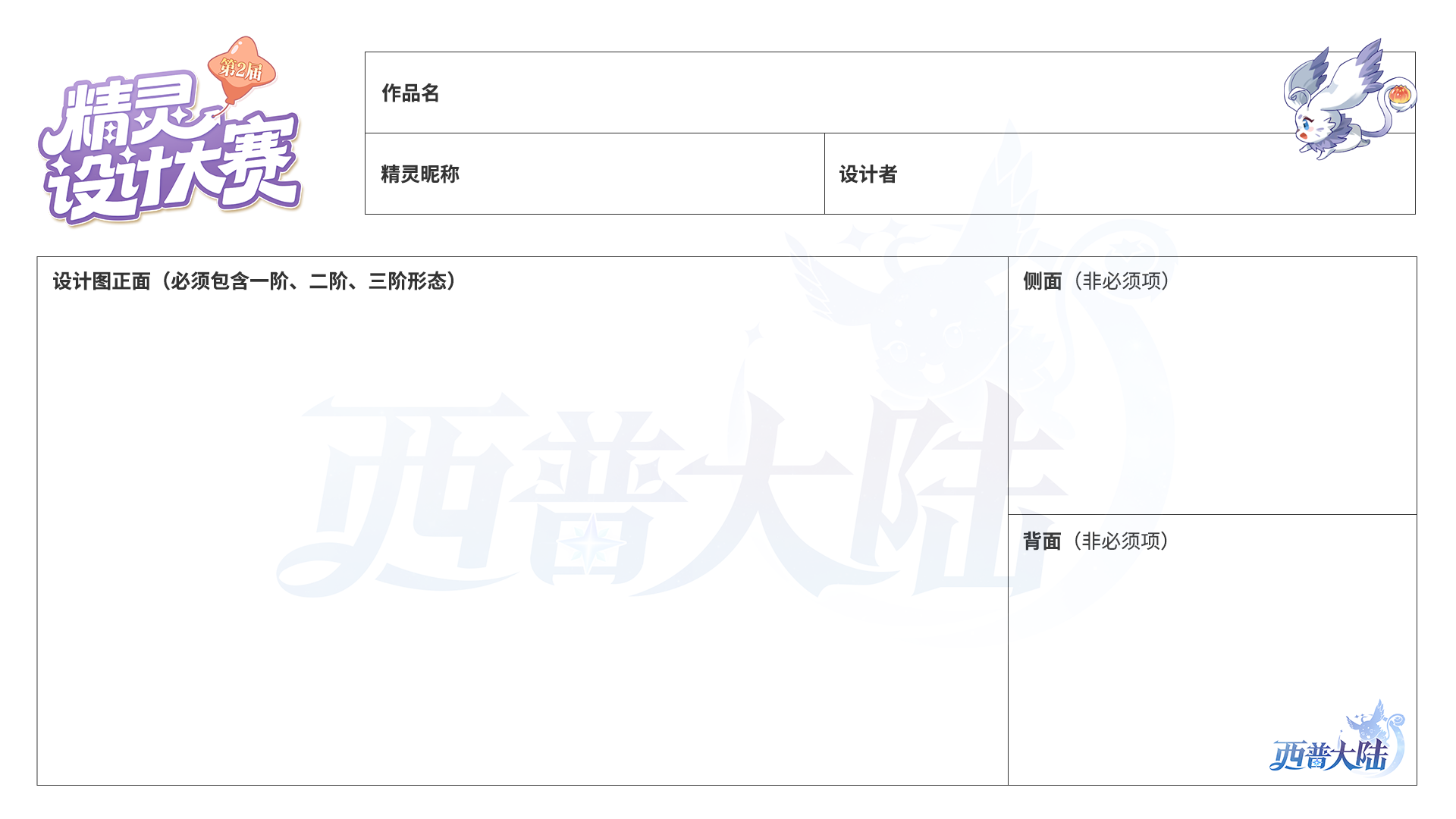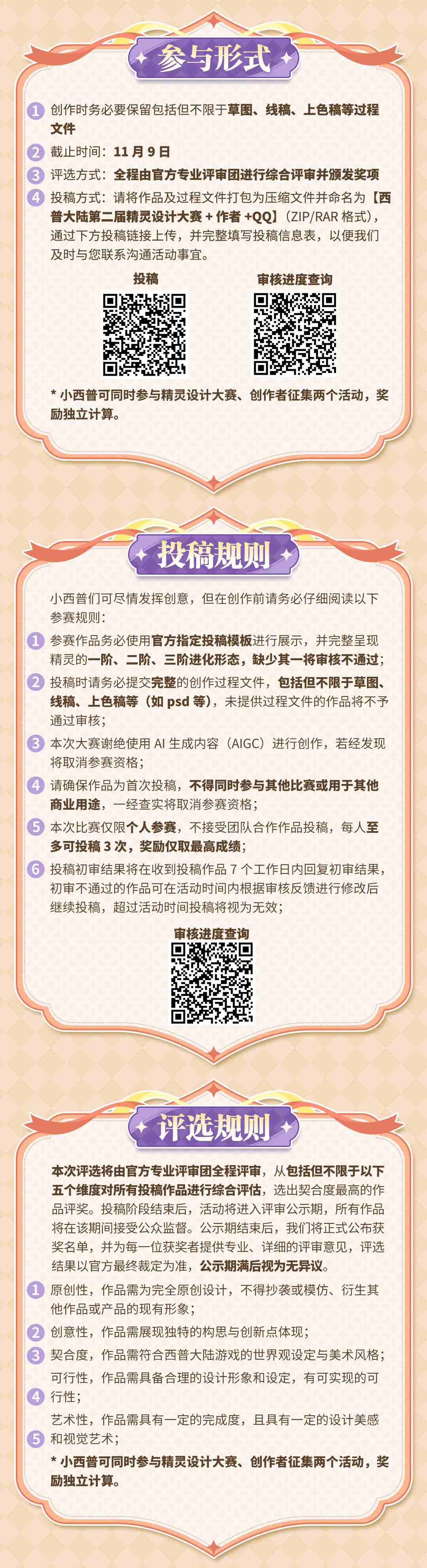 4.投稿方式:请将作品及过程文件打包为压缩文件并命名为【西普大陆第二届精灵设计大赛+作者+QQ】(ZIP/RAR格式),通过下方投稿链接上传,并完整填写投稿信息表,以便我们及时与您联系沟通活动事宜。