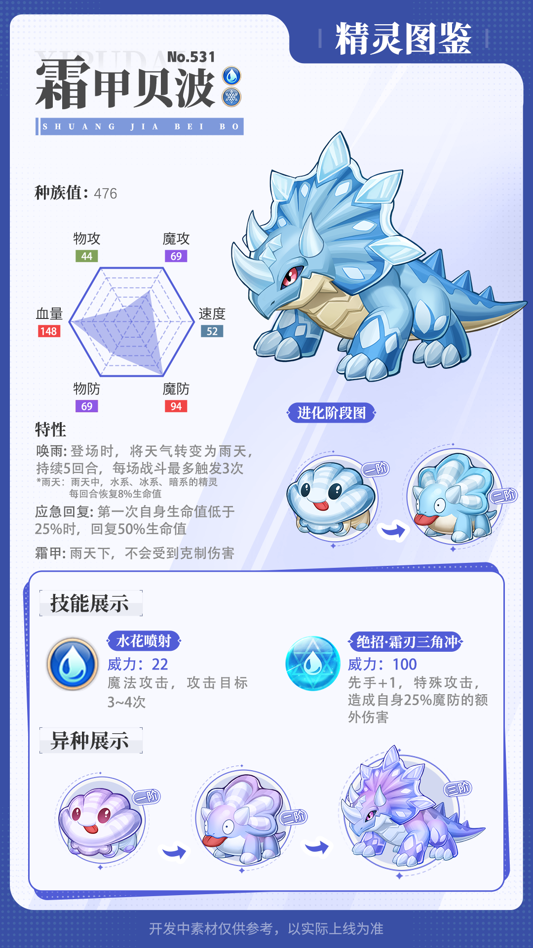 只有通过深潭试炼的贝波,才能获得龙神赐予的冰系力量,进化为霜甲贝波。霜甲贝波是元龙阵营中强有力的卫者,相信在它们的庇护下,希望梯田将更加安宁繁荣。