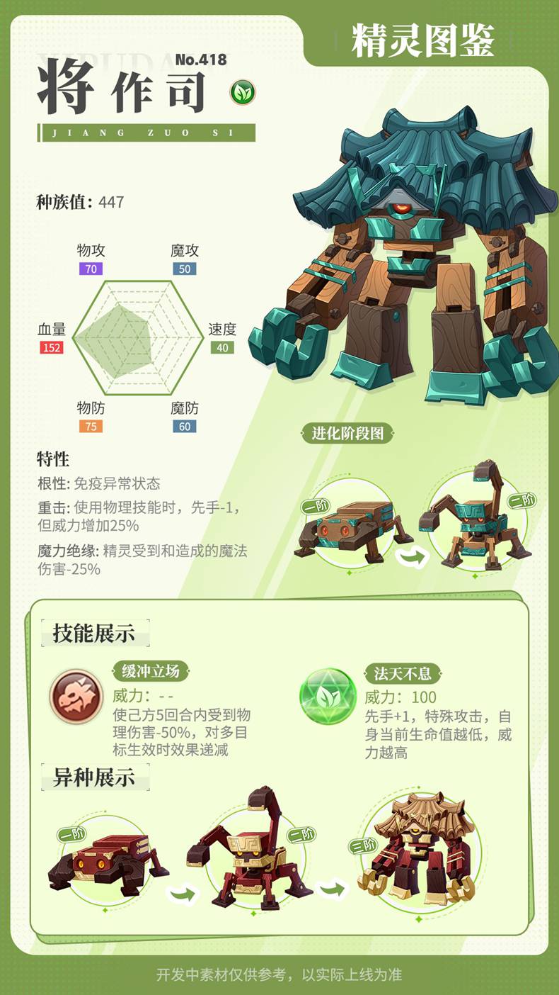 木工蚁的钳子长时间没有夹着重物就会变得错乱,所以经常能看到木工蚁如同搬运工似的排成一排的运送货物。随着体型结构成长,进化后成为木匠师,它不仅可以从事更加复杂的工作,战斗力也显著提高,但这还不是它的最终形态。看上去手部笨重却异常的灵活的将作司,休息时会变身楼阁藏身于建筑群之间,千塔林便是其杰作之一。