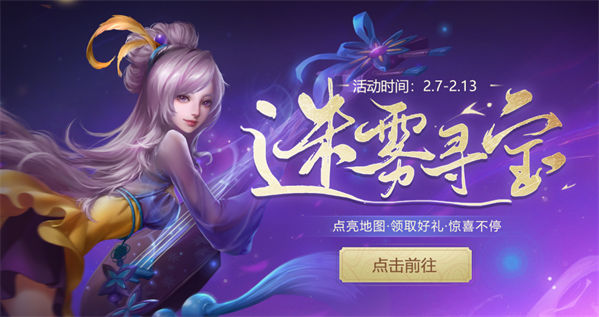 2月7日-2月13日,进入活动并参与寻宝,点亮地图即有机会获得红炎双刃-零域翼刃皮肤、小乔-铜雀仙子皮肤、圣枪使-猎龙游侠皮肤、暗月猎手-赤羽风灵皮肤等精美好礼!
