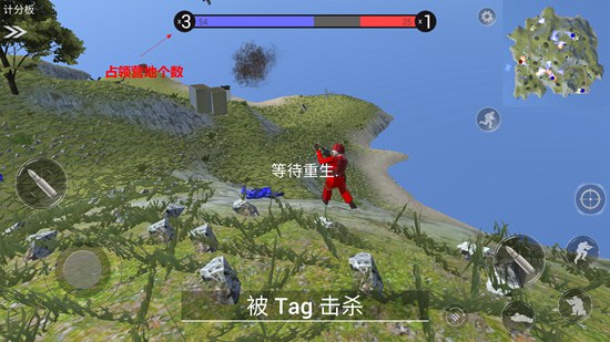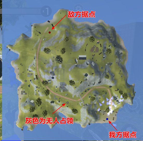 当蓝队得分超过红队得分100分时,则蓝队胜利,反之则红队胜利。得分根据据点的占领个数以及击击败敌人头来评定,可以看顶部的势力条来判断。人物死亡时会从已占领的营地中复活,若没有我们营地时,游戏判负。