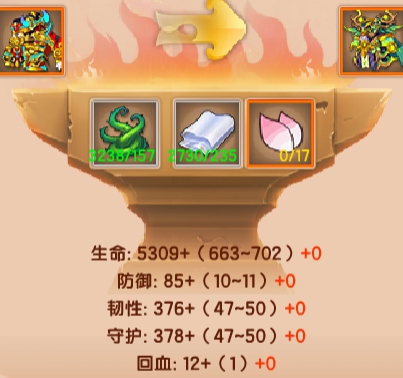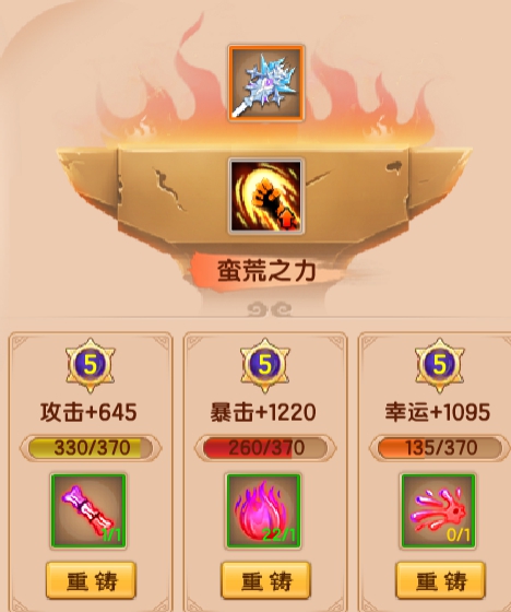 4.装备重铸:装备重铸会额外增加装备的属性。不同部件的装备提供的属性不同。装备重铸需要蛮荒材料,蛮荒击杀应龙后开启,蛮荒材料通过击杀蛮荒BOSS获取。随着重铸等级的提高,需要的蛮荒材料也不相同,数量也有所提高。不同角色、不同部件所需要的蛮荒材料不同。目前各联盟比较稀缺的蛮荒材料有骨、火,猴子、二郎职业对骨火的需求量非常高,反之沙僧对稀有材料的需求小。这也是为什么推荐大联盟的原因之一,大联盟高战会带蛮荒,联盟仓库也比较充足,有对应的材料。注:不是每个大联盟的材料均充足,也不是每个大联盟都会勤快带人。