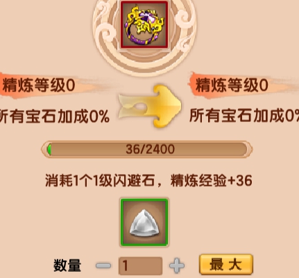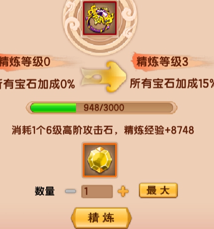 6.装备精炼:装备精炼在击杀完应龙后开启。装备精炼是增加实战的重要一环,通过喂宝石的形式来增加装备精炼的进度。不同等级的宝石会增加不同进度,满精炼是20级。20级精炼可使镶嵌宝石的数值×2。这里推荐喂命中、韧性、回血、防御、守护宝石来增加精炼进度。同类型装备精炼可以传承,只需要20000灵魂即可,所以只需精炼一件即可。