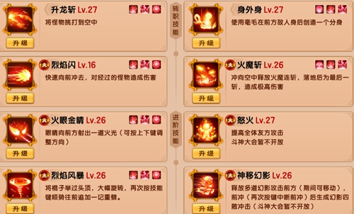 技能是各职业主要输出手段。技能分为初级技能×4,转职技能×2,进阶技能×2,被动技能和无双技能。一般我们选取二转后的buff技能,二转后的输出技能,位移技能,以及两个初级技能为技能搭配,当然,有的职业是不需要带二转buff的。被动技能与无双技能通常我们均携带一转后的技能。关于技能加点,我的经验是,主要输出技能为我总体蓝量的1/20-1/15,例如我是幻变,则我的火魔耗蓝点到稍高于1/20,神移则是1/15。10W蓝以上的时候,buff与输出技能点满,位移技能点到最短CD便好。