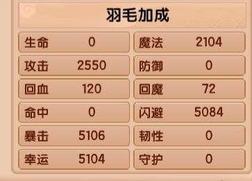 羽毛也是造5数值中的重要一环。羽毛有:绿,蓝,紫,金,红,橙,6种品质。随着品质的进阶属性条会有所增加,如,绿仅有1条属性,而橙有6条,数值也会有所增加。绿,蓝,紫,通过天树王获得。而金色通过炼丹炉炼制。红色与橙色则是氪金获取,每年春节可以白嫖一个红毛。关于羽毛的属性分为以为几种:
