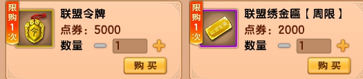 联盟令牌、联盟绣金匾:令牌不推荐购买,如果要创建联盟元宝购买。不推荐创联盟,加入即可。改名比买绣金匾。