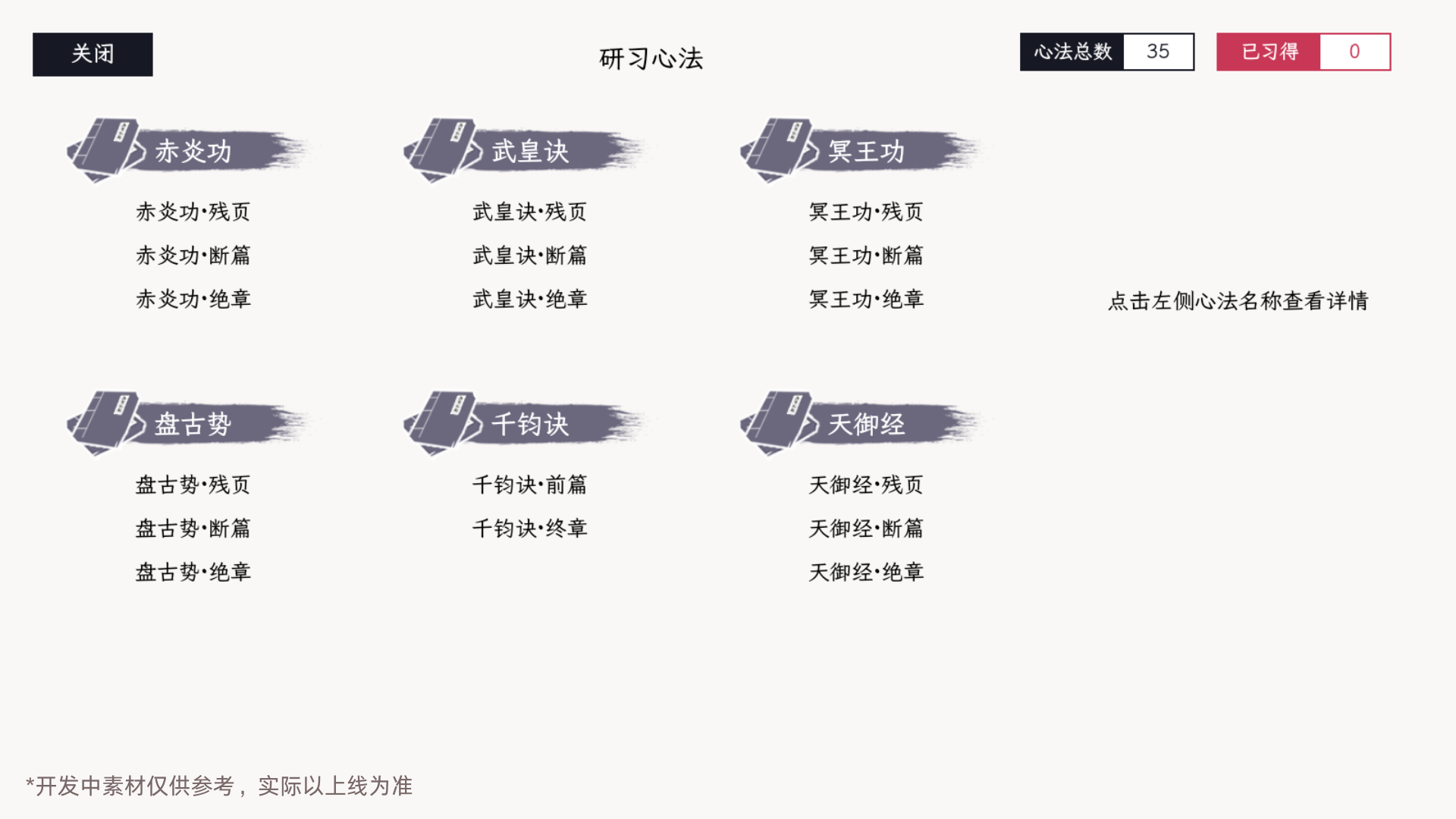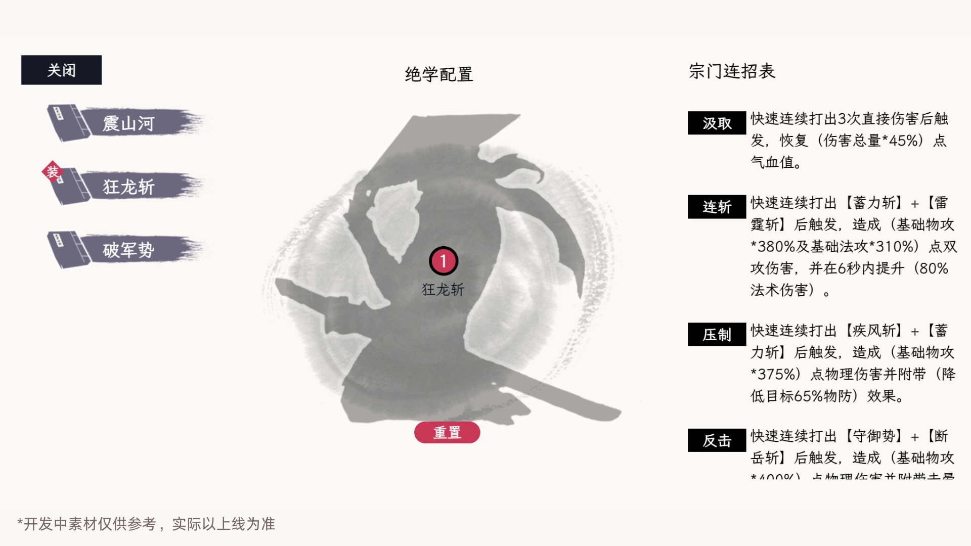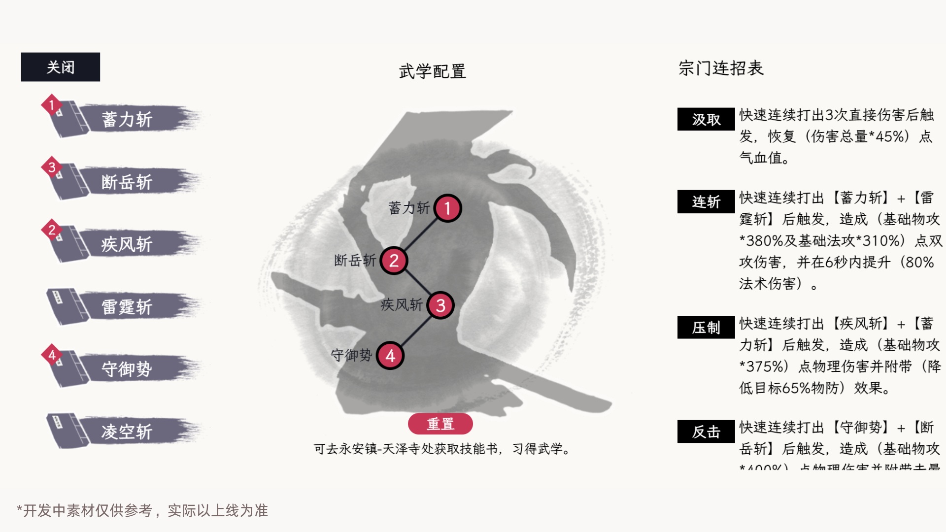 少侠可通过技能书习得门派专属技能,每种职业可习得7个基础武学以及3个门派绝学以及35个门派心法,同时,少侠可以配置4个技能以及1个绝学用于战斗。不同的基础武学配置,会产生不同的连招效果。(此处以刀客为例)